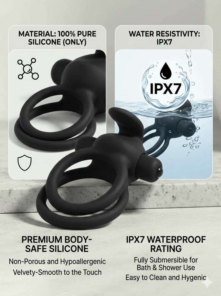 Made from soft, body-safe silicone, this ring fits comfortably and securely. Its flexible design ensures safety and comfort, while the waterproof feature allows use in different settings and makes cleaning effortless. The ring’s vibrations provide stimulation to sensitive areas, supporting longer-lasting performance and heightened sensation for all partners involved.
